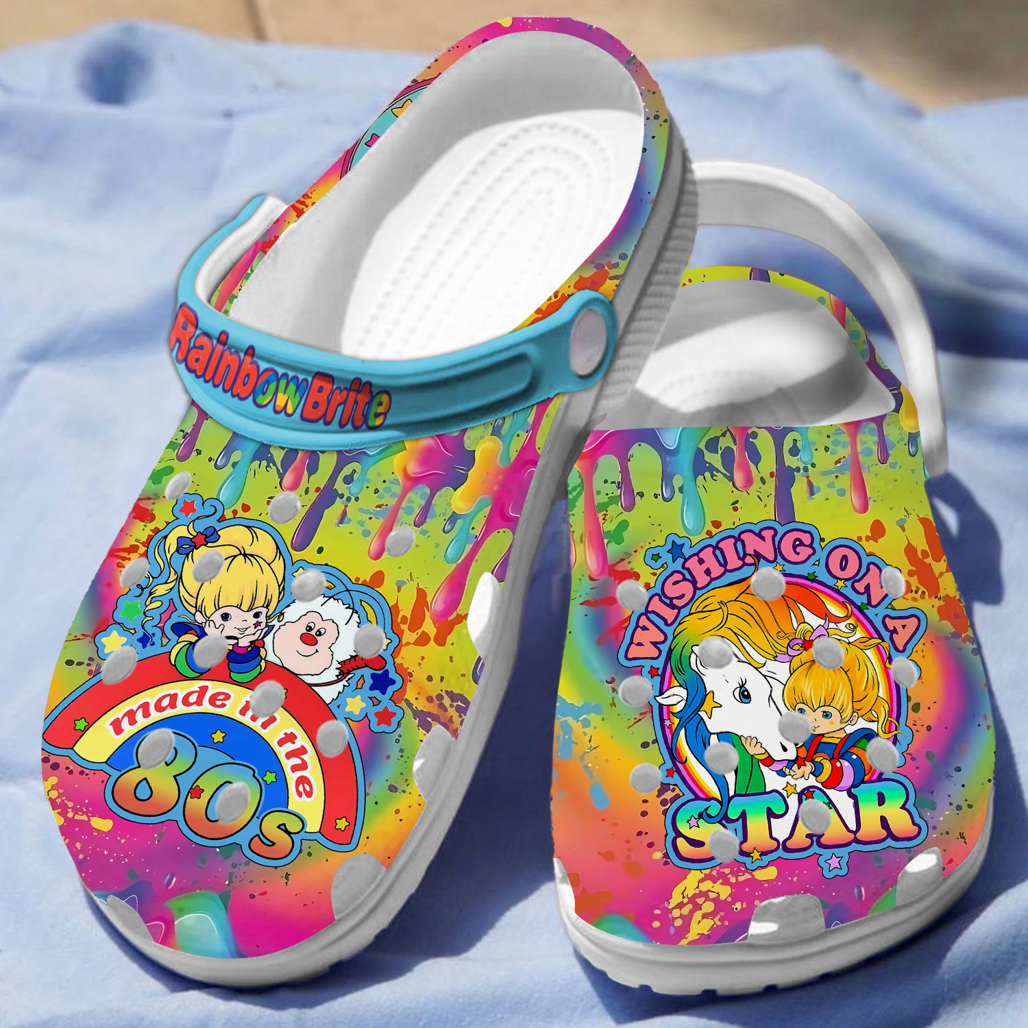 Size ChartLet’s upgrade your outfit and become stylish in every step with our stunning Colorful Rainbow Brite Made In The 80S Clogs Shoes in the trendy collection of Cartoon Clogs.