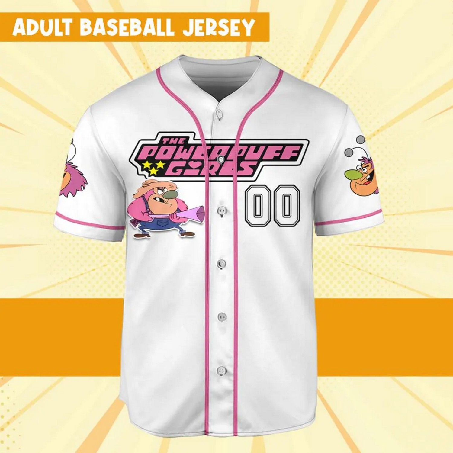 Custom Name And Number Disney Powerpuff Girls Fuzzy Lumpkins Simple White Baseball Jersey