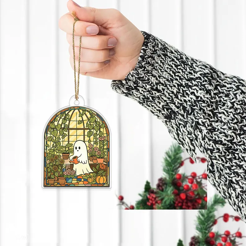 Cute Ghost Gardening Acrylic Ornament, Adorable Ghost Greenhouse Halloween Plant Lover Design