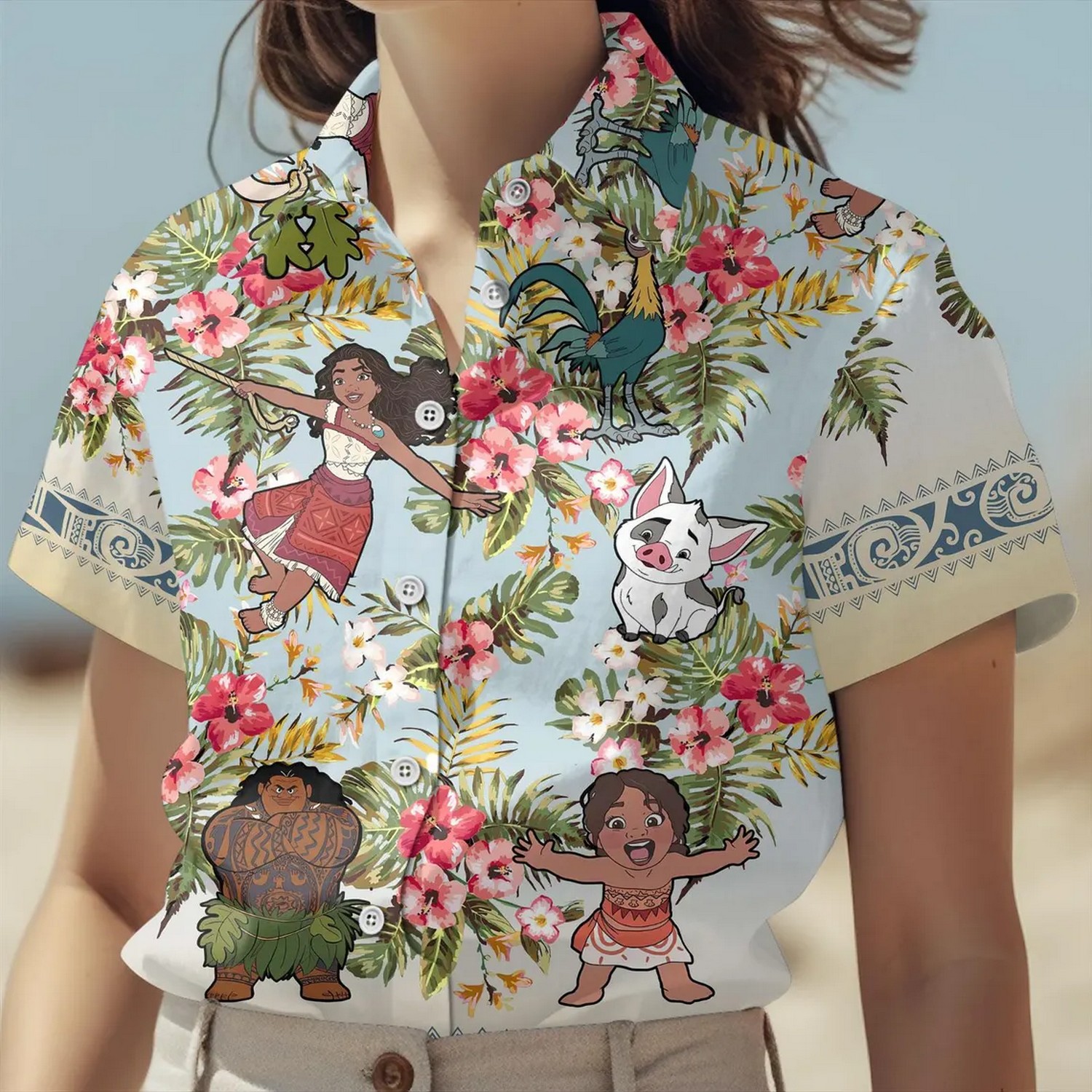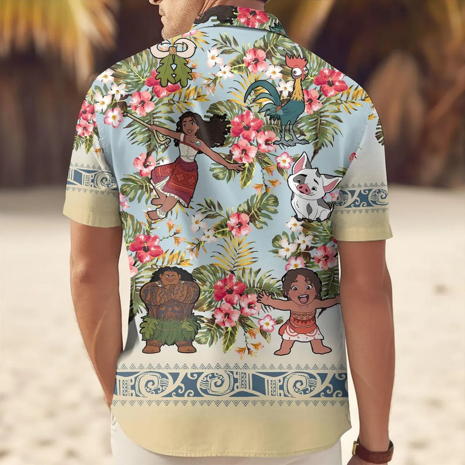 Disney Princess Moana Green Tropical Island And Native Pattern Hawaiian Shirt