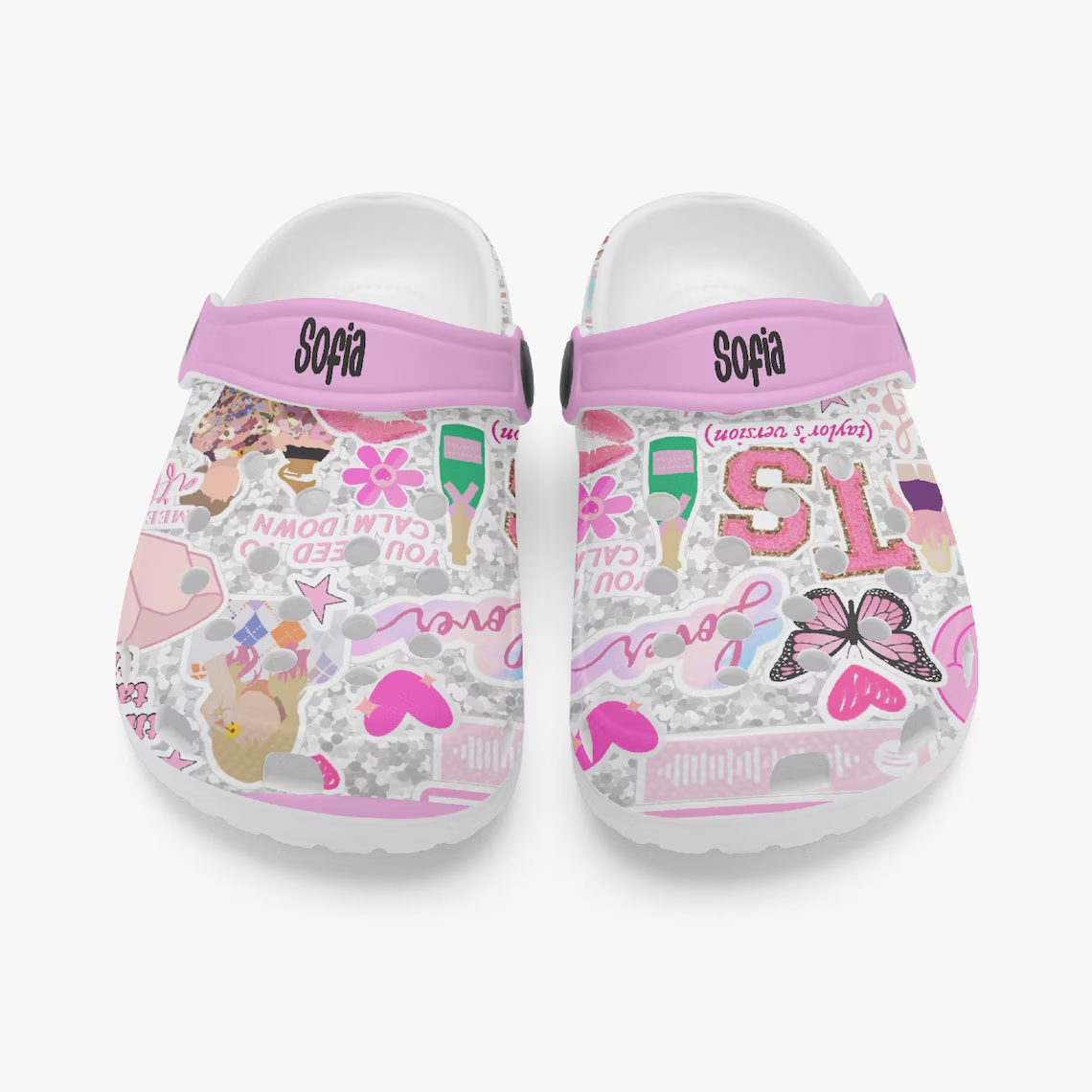 Size ChartLet’s upgrade your outfit and become stylish in every step with our stunning Eye-catching Clogs Taylor’s Version Pink And Glitter Clogs Shoes in the trendy collection of Cartoon Clogs.