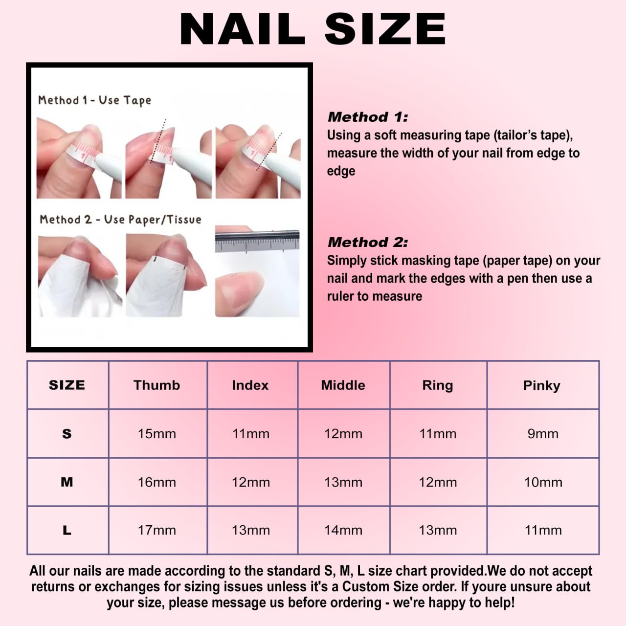 – All of my nails are handmade and customized to fit your size. Please note that I can make any size and any shape you desire. Feel free to contact me if you would like some customization made.