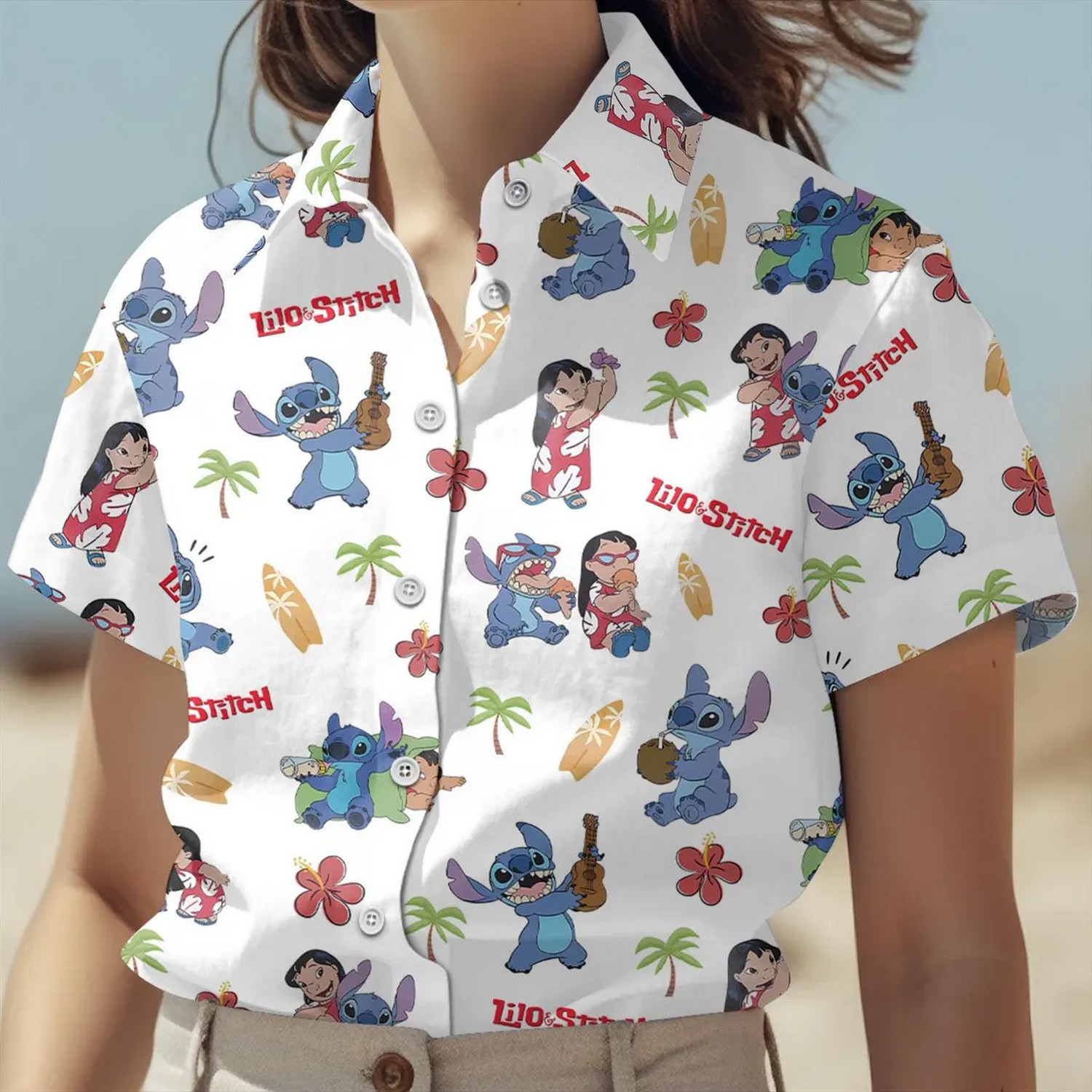 Lolo And Stitch Cartoon Happy Summer Holiday Whtie Hawaiian Shirt