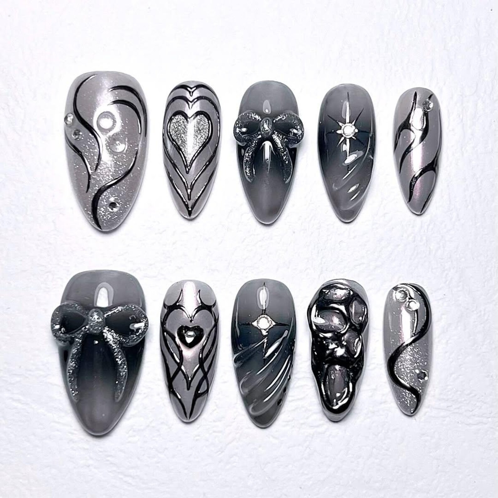 Gothic Chrome Black and Silver Nails with 3D Heart, Edgy Handmade Nail Set