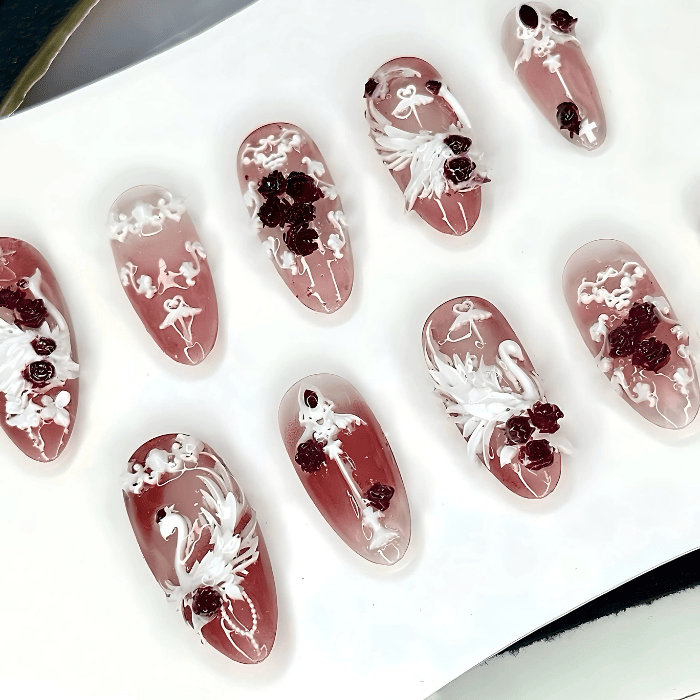 Blushing Love Bow Hand-Painted Press On Nails, Handmade Nail Set