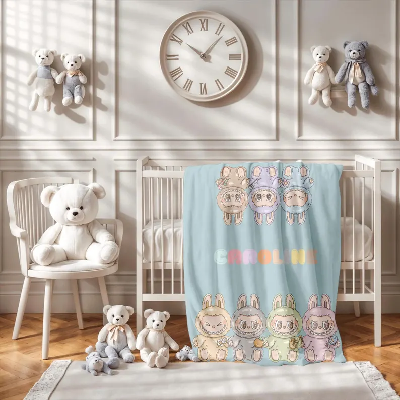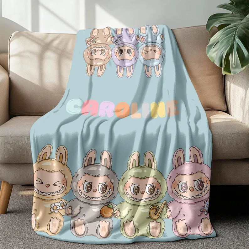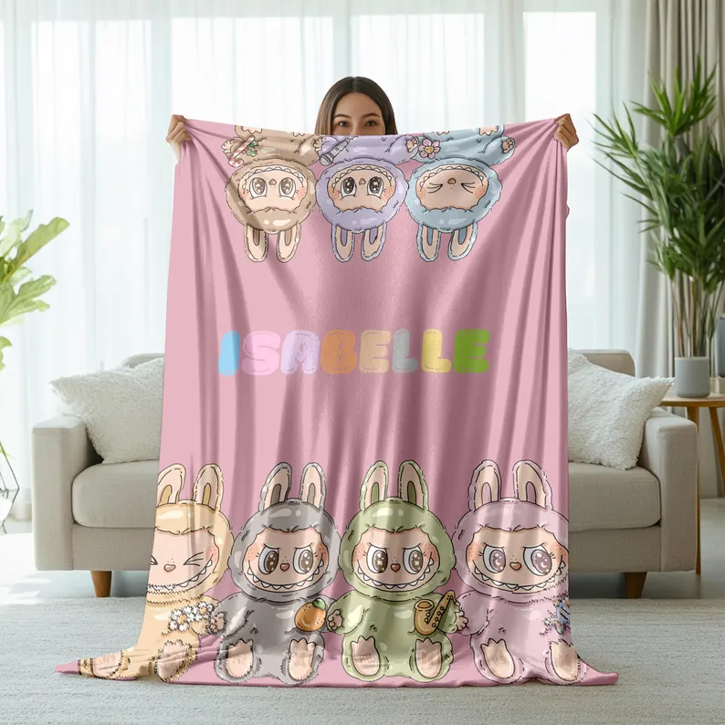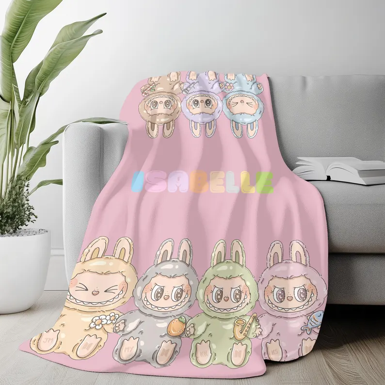 Personalized Labubu Monsters And Colorful Bows Full-Printed Green Fleece Blanket