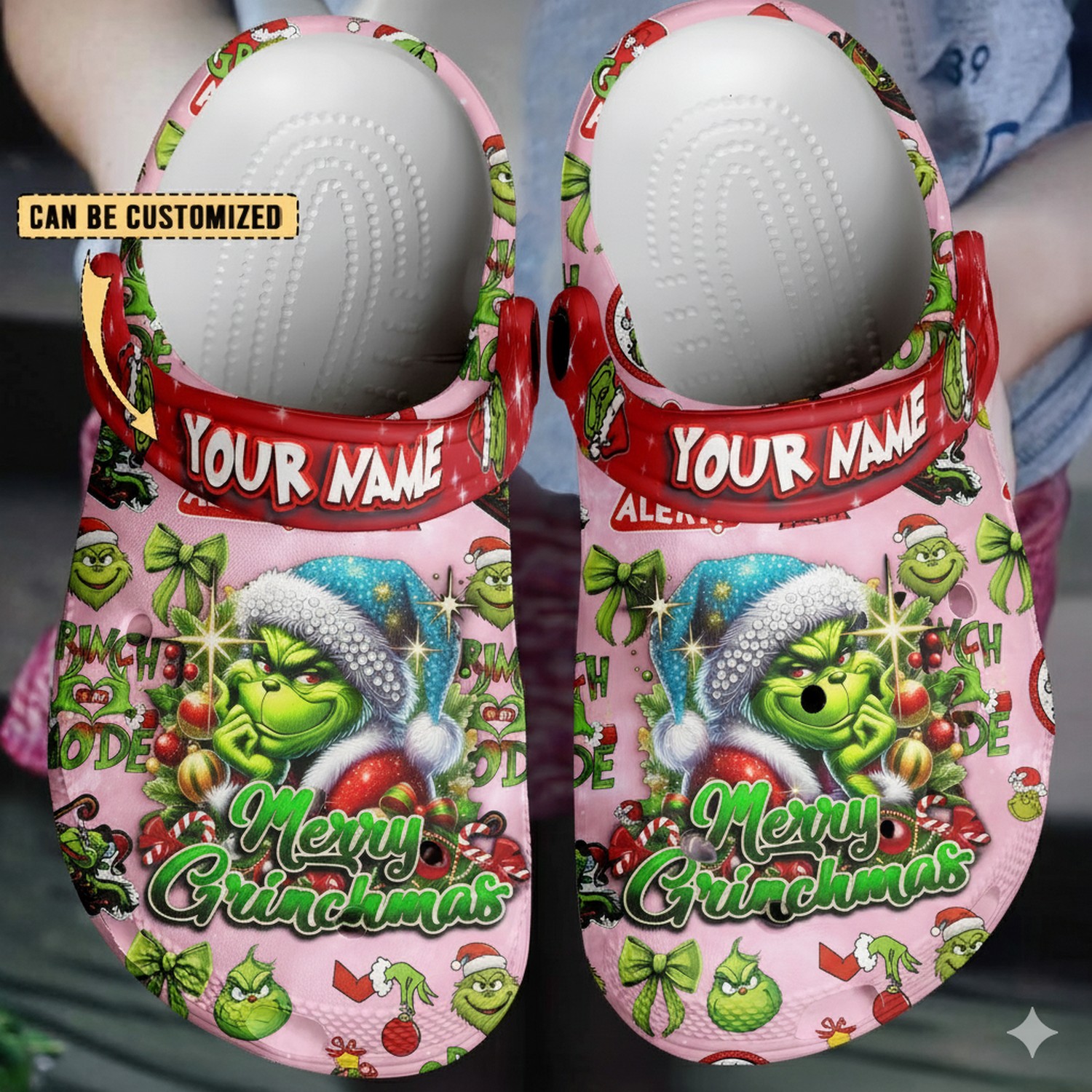 Custom Name Grinch Christmas Pink Clogs For Kids And Adults