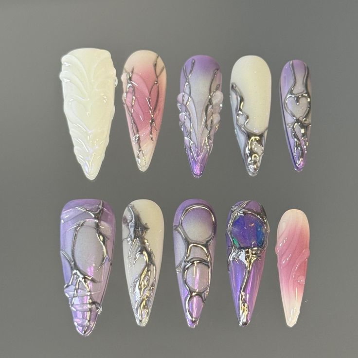 Twilight Violet Swirl Silver Brush Painted Presson Nail Set with 3D Metallic Vibes and Purple Palette